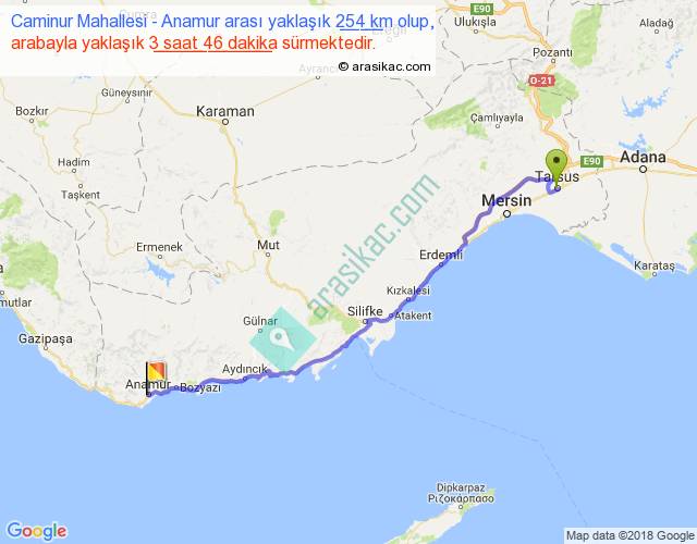 Caminur Mahallesi - Anamur arası yaklaşık olarak 90 km/h ile yukarıda belirtilen sürede olup, iki yerin kuş uçuşu uzaklığı (mesafesi) 205'dir. Yolculuk otobüsle 4 saat 53 dakika sürmektedir.