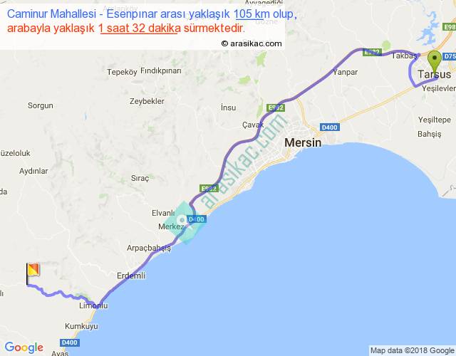 Caminur Mahallesi - Esenpınar arası yaklaşık olarak 90 km/h ile yukarıda belirtilen sürede olup, iki yerin kuş uçuşu uzaklığı (mesafesi) 78'dir. Yolculuk otobüsle 1 saat 59 dakika sürmektedir.