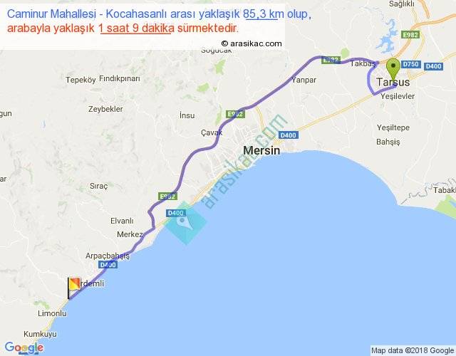 Caminur Mahallesi - Kocahasanlı arası yaklaşık olarak 90 km/h ile yukarıda belirtilen sürede olup, iki yerin kuş uçuşu uzaklığı (mesafesi) 66'dir. Yolculuk otobüsle 1 saat 29 dakika sürmektedir.