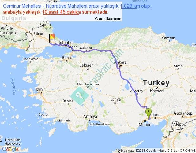Caminur Mahallesi - Nusratiye Mahallesi arası yaklaşık olarak 90 km/h ile yukarıda belirtilen sürede olup, iki yerin kuş uçuşu uzaklığı (mesafesi) 767'dir. Eğer belirtilen yerler arasında uçak seferi var ise bu süre uçakla 1 saat 10 dakika'ya kadar düşebilir. Yolculuk otobüsle 13 saat 58 dakika sürmektedir.
