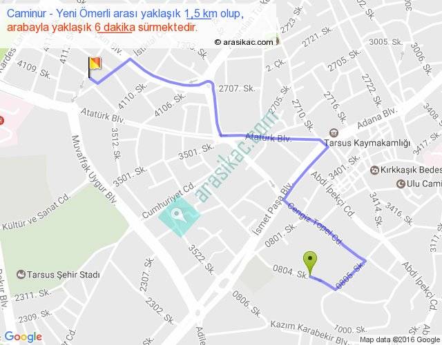 Caminur - Yeni Ömerli arası yaklaşık olarak 90 km/h ile yukarıda belirtilen sürede olup, iki yerin kuş uçuşu uzaklığı (mesafesi) 1'dir. Yolculuk otobüsle 7 dakika sürmektedir.