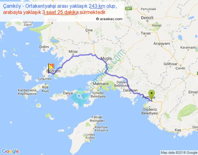 Çamköy - Ortakentyahşi arası yaklaşık olarak 90 km/h ile yukarıda belirtilen sürede olup, iki yerin kuş uçuşu uzaklığı (mesafesi) 168'dir. Yolculuk otobüsle 4 saat 26 dakika sürmektedir.
