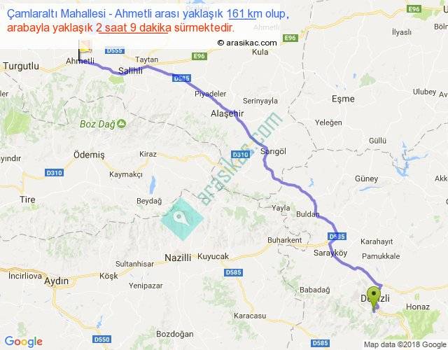 Çamlaraltı Mahallesi - Ahmetli arası yaklaşık olarak 90 km/h ile yukarıda belirtilen sürede olup, iki yerin kuş uçuşu uzaklığı (mesafesi) 132'dir. Yolculuk otobüsle 2 saat 47 dakika sürmektedir.