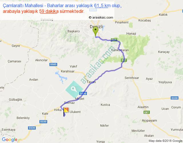 Çamlaraltı Mahallesi - Baharlar arası yaklaşık olarak 90 km/h ile yukarıda belirtilen sürede olup, iki yerin kuş uçuşu uzaklığı (mesafesi) 36'dir. Yolculuk otobüsle 1 saat 16 dakika sürmektedir.