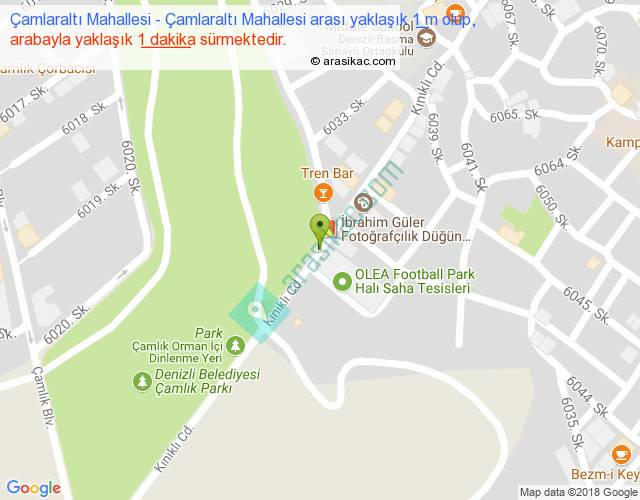 Çamlaraltı Mahallesi - Çamlaraltı Mahallesi arası yaklaşık olarak 90 km/h ile yukarıda belirtilen sürede olup, iki yerin kuş uçuşu uzaklığı (mesafesi) 0'dir. Yolculuk otobüsle 1 dakika sürmektedir.
