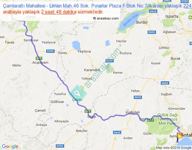 Çamlaraltı Mahallesi - Liman Mah.46 Sok. Pınarlar Plaza F Blok No:7 A arası yaklaşık olarak 90 km/h ile yukarıda belirtilen sürede olup, iki yerin kuş uçuşu uzaklığı (mesafesi) 166'dir. Yolculuk otobüsle 3 saat 38 dakika sürmektedir.