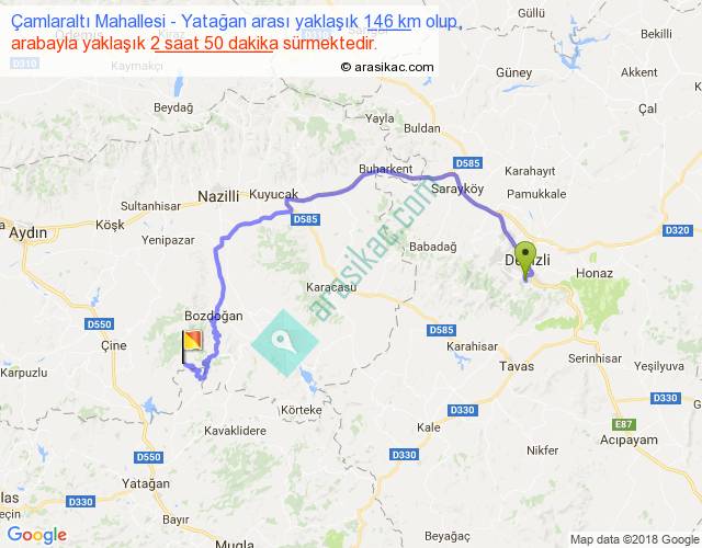 Çamlaraltı Mahallesi - Yatağan arası yaklaşık olarak 90 km/h ile yukarıda belirtilen sürede olup, iki yerin kuş uçuşu uzaklığı (mesafesi) 77'dir. Yolculuk otobüsle 3 saat 41 dakika sürmektedir.