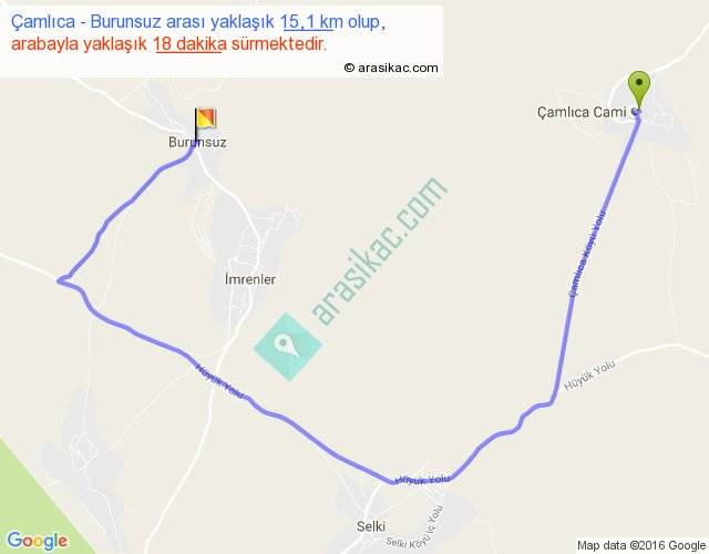 Çamlıca - Burunsuz arası yaklaşık olarak 90 km/h ile yukarıda belirtilen sürede olup, iki yerin kuş uçuşu uzaklığı (mesafesi) 6'dir. Yolculuk otobüsle 23 dakika sürmektedir.