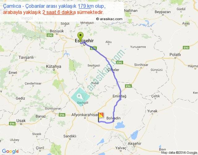 Çamlıca - Çobanlar arası yaklaşık olarak 90 km/h ile yukarıda belirtilen sürede olup, iki yerin kuş uçuşu uzaklığı (mesafesi) 123'dir. Yolculuk otobüsle 2 saat 43 dakika sürmektedir.