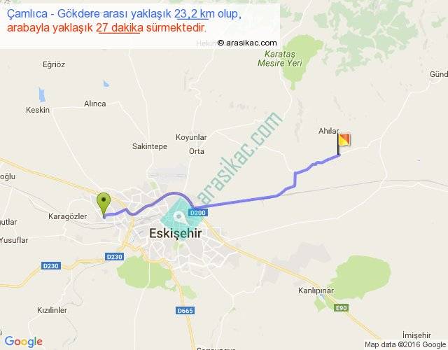 Çamlıca - Gökdere arası yaklaşık olarak 90 km/h ile yukarıda belirtilen sürede olup, iki yerin kuş uçuşu uzaklığı (mesafesi) 20'dir. Yolculuk otobüsle 35 dakika sürmektedir.