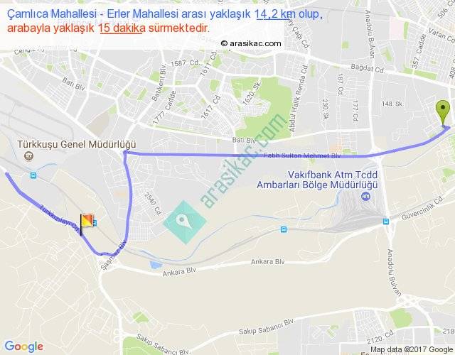 Çamlıca Mahallesi - Erler Mahallesi arası yaklaşık olarak 90 km/h ile yukarıda belirtilen sürede olup, iki yerin kuş uçuşu uzaklığı (mesafesi) 8'dir. Yolculuk otobüsle 19 dakika sürmektedir.