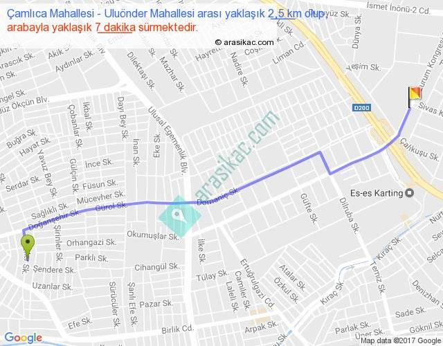 Çamlıca Mahallesi - Uluönder Mahallesi arası yaklaşık olarak 90 km/h ile yukarıda belirtilen sürede olup, iki yerin kuş uçuşu uzaklığı (mesafesi) 2'dir. Yolculuk otobüsle 9 dakika sürmektedir.