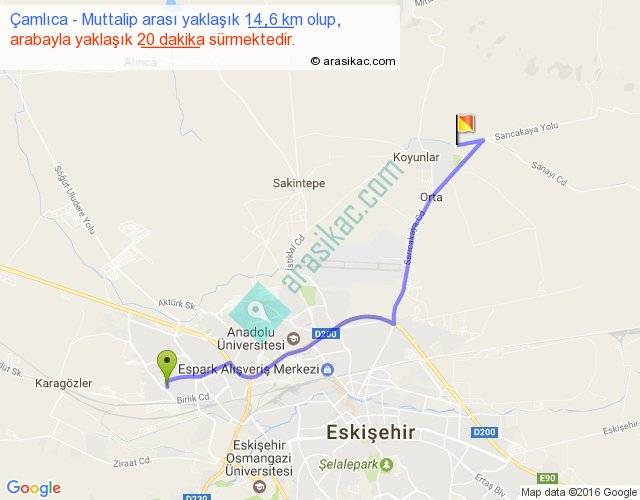Çamlıca - Muttalip arası yaklaşık olarak 90 km/h ile yukarıda belirtilen sürede olup, iki yerin kuş uçuşu uzaklığı (mesafesi) 11'dir. Yolculuk otobüsle 26 dakika sürmektedir.