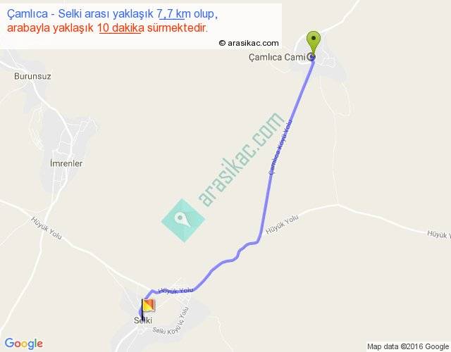 Çamlıca - Selki arası yaklaşık olarak 90 km/h ile yukarıda belirtilen sürede olup, iki yerin kuş uçuşu uzaklığı (mesafesi) 7'dir. Yolculuk otobüsle 13 dakika sürmektedir.