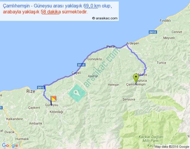 Çamlıhemşin - Güneysu arası yaklaşık olarak 90 km/h ile yukarıda belirtilen sürede olup, iki yerin kuş uçuşu uzaklığı (mesafesi) 34'dir. Yolculuk otobüsle 1 saat 15 dakika sürmektedir.
