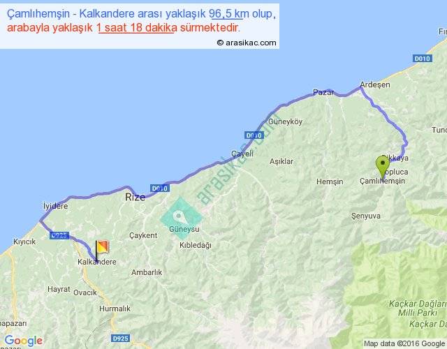 Çamlıhemşin - Kalkandere arası yaklaşık olarak 90 km/h ile yukarıda belirtilen sürede olup, iki yerin kuş uçuşu uzaklığı (mesafesi) 49'dir. Yolculuk otobüsle 1 saat 41 dakika sürmektedir.