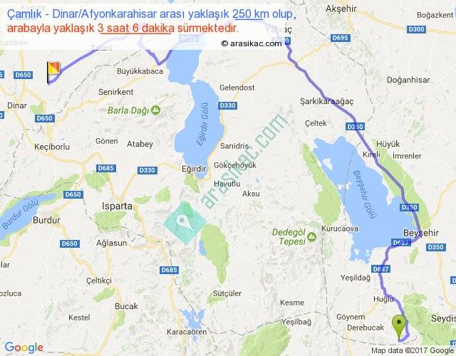 Çamlık - Dinar Afyonkarahisar arası yaklaşık olarak 90 km/h ile yukarıda belirtilen sürede olup, iki yerin kuş uçuşu uzaklığı (mesafesi) 146'dir. Yolculuk otobüsle 4 saat 1 dakika sürmektedir.