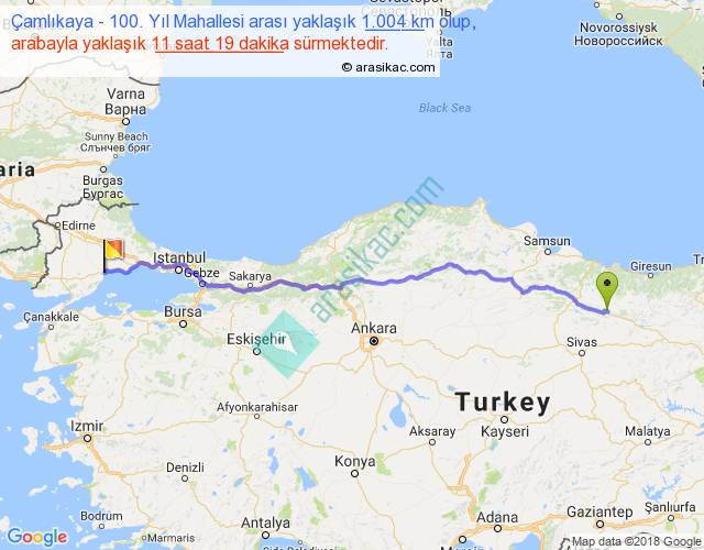 Çamlıkaya - 100. Yıl Mahallesi arası yaklaşık olarak 90 km/h ile yukarıda belirtilen sürede olup, iki yerin kuş uçuşu uzaklığı (mesafesi) 843'dir. Eğer belirtilen yerler arasında uçak seferi var ise bu süre uçakla 1 saat 17 dakika'ya kadar düşebilir. Yolculuk otobüsle 14 saat 42 dakika sürmektedir.