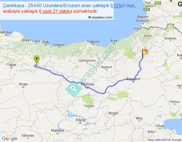 Çamlıkaya - 25440 Uzundere Erzurum arası yaklaşık olarak 90 km/h ile yukarıda belirtilen sürede olup, iki yerin kuş uçuşu uzaklığı (mesafesi) 345'dir. Eğer belirtilen yerler arasında uçak seferi var ise bu süre uçakla 31 dakika'ya kadar düşebilir. Yolculuk otobüsle 8 saat 15 dakika sürmektedir.