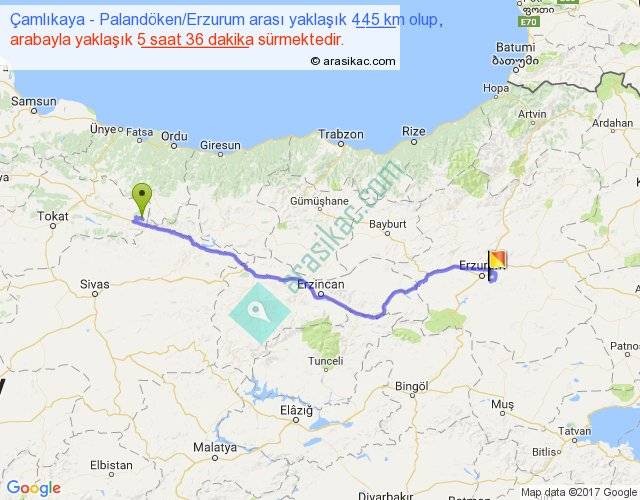 Çamlıkaya - Palandöken Erzurum arası yaklaşık olarak 90 km/h ile yukarıda belirtilen sürede olup, iki yerin kuş uçuşu uzaklığı (mesafesi) 328'dir. Eğer belirtilen yerler arasında uçak seferi var ise bu süre uçakla 30 dakika'ya kadar düşebilir. Yolculuk otobüsle 7 saat 16 dakika sürmektedir.