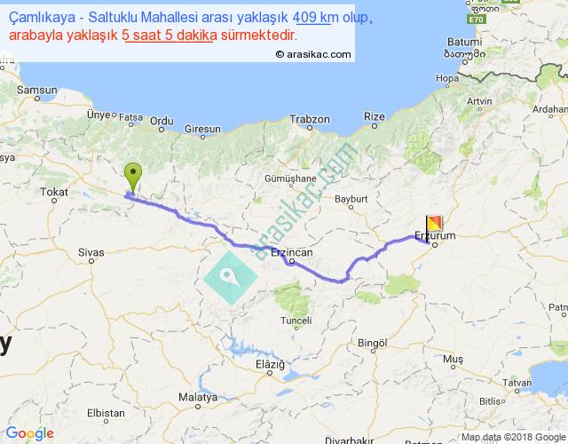 Çamlıkaya - Saltuklu Mahallesi arası yaklaşık olarak 90 km/h ile yukarıda belirtilen sürede olup, iki yerin kuş uçuşu uzaklığı (mesafesi) 312'dir. Eğer belirtilen yerler arasında uçak seferi var ise bu süre uçakla 28 dakika'ya kadar düşebilir. Yolculuk otobüsle 6 saat 36 dakika sürmektedir.