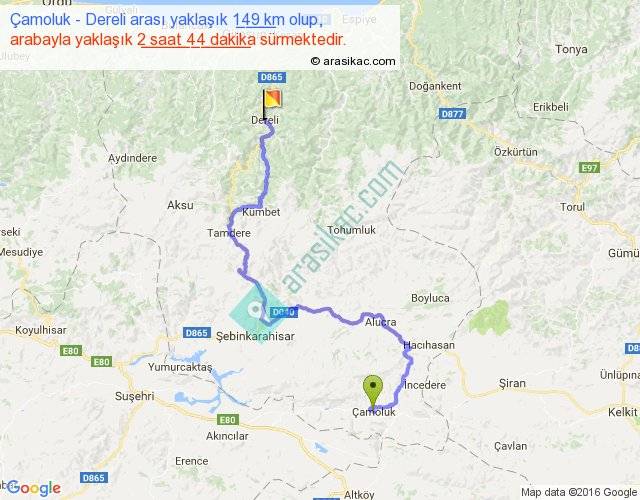 Çamoluk - Dereli arası yaklaşık olarak 90 km/h ile yukarıda belirtilen sürede olup, iki yerin kuş uçuşu uzaklığı (mesafesi) 72'dir. Yolculuk otobüsle 3 saat 33 dakika sürmektedir.
