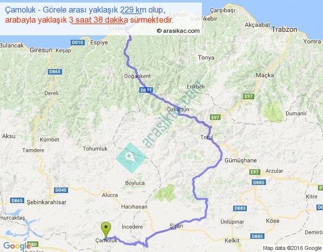 Çamoluk - Görele arası yaklaşık olarak 90 km/h ile yukarıda belirtilen sürede olup, iki yerin kuş uçuşu uzaklığı (mesafesi) 102'dir. Yolculuk otobüsle 4 saat 43 dakika sürmektedir.