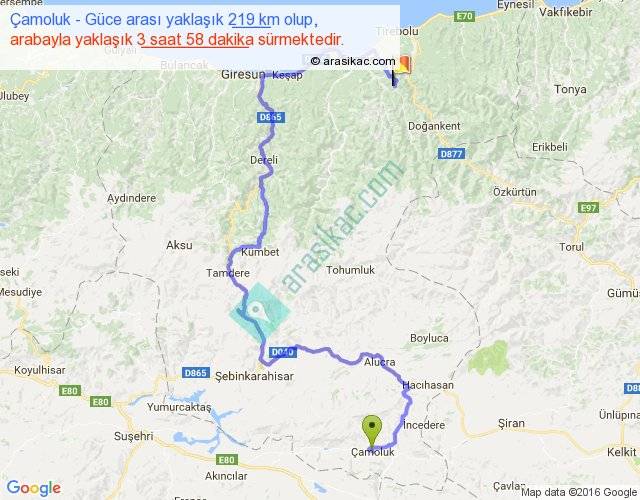 Çamoluk - Güce arası yaklaşık olarak 90 km/h ile yukarıda belirtilen sürede olup, iki yerin kuş uçuşu uzaklığı (mesafesi) 85'dir. Yolculuk otobüsle 5 saat 9 dakika sürmektedir.