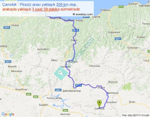 Eğer Çamoluk Piraziz arası ne kadar yakar (benzin/mazot) diyorsanız, kilometrede 3 ₺ yakan bir aracınız var ise 618, km'de 4 ₺ yakan bir aracınız var ise 824, km'de 5 ₺ yakan bir aracınız var ise 1030 ile bu yolculuğu tamamlayabilirsiniz.