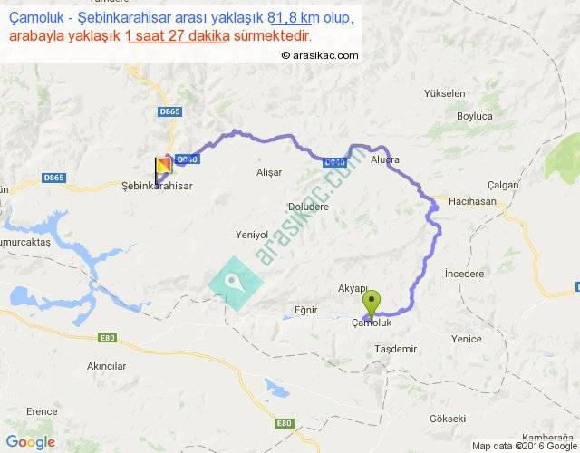 Çamoluk - Şebinkarahisar arası yaklaşık olarak 90 km/h ile yukarıda belirtilen sürede olup, iki yerin kuş uçuşu uzaklığı (mesafesi) 33'dir. Yolculuk otobüsle 1 saat 53 dakika sürmektedir.