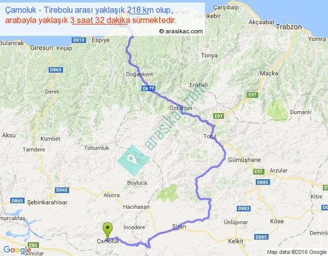 Eğer Çamoluk Tirebolu arası ne kadar yakar (benzin/mazot) diyorsanız, kilometrede 3 ₺ yakan bir aracınız var ise 654, km'de 4 ₺ yakan bir aracınız var ise 872, km'de 5 ₺ yakan bir aracınız var ise 1090 ile bu yolculuğu tamamlayabilirsiniz.