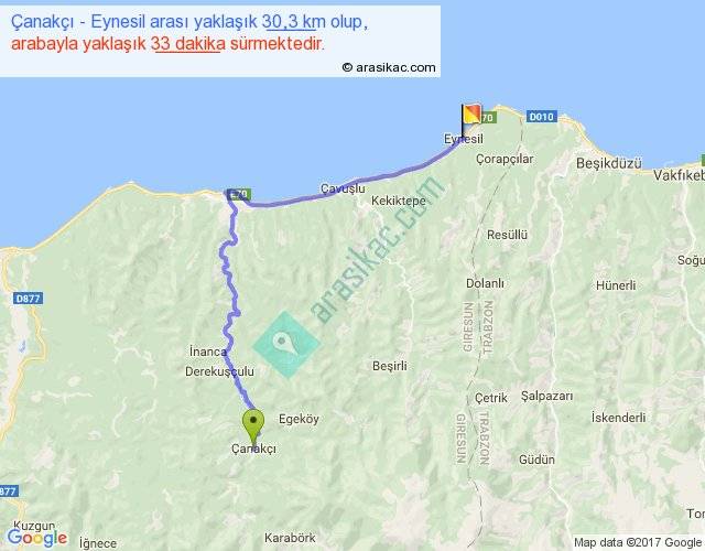 Çanakçı - Eynesil arası yaklaşık olarak 90 km/h ile yukarıda belirtilen sürede olup, iki yerin kuş uçuşu uzaklığı (mesafesi) 20'dir. Yolculuk otobüsle 42 dakika sürmektedir.