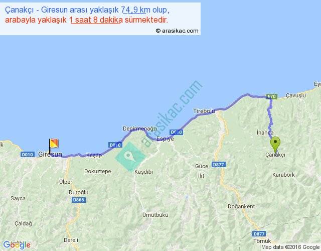 Çanakçı - Giresun arası yaklaşık olarak 90 km/h ile yukarıda belirtilen sürede olup, iki yerin kuş uçuşu uzaklığı (mesafesi) 52'dir. Yolculuk otobüsle 1 saat 28 dakika sürmektedir.