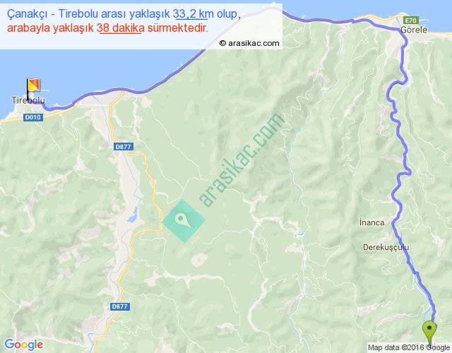 Çanakçı - Tirebolu arası yaklaşık olarak 90 km/h ile yukarıda belirtilen sürede olup, iki yerin kuş uçuşu uzaklığı (mesafesi) 19'dir. Yolculuk otobüsle 49 dakika sürmektedir.