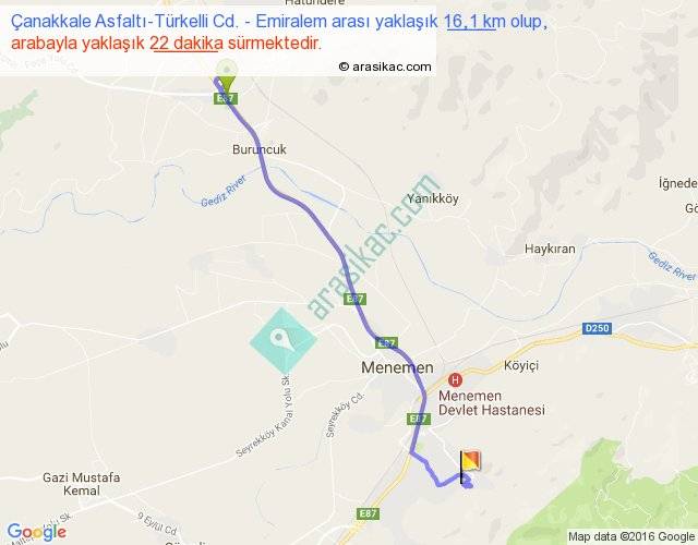 Çanakkale Asfaltı-Türkelli Cd. - Emiralem arası yaklaşık olarak 90 km/h ile yukarıda belirtilen sürede olup, iki yerin kuş uçuşu uzaklığı (mesafesi) 12'dir. Yolculuk otobüsle 28 dakika sürmektedir.