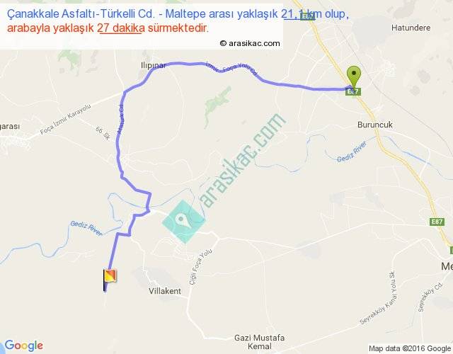 Çanakkale Asfaltı-Türkelli Cd. - Maltepe arası yaklaşık olarak 90 km/h ile yukarıda belirtilen sürede olup, iki yerin kuş uçuşu uzaklığı (mesafesi) 13'dir. Yolculuk otobüsle 35 dakika sürmektedir.