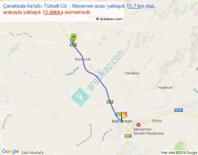 Çanakkale Asfaltı-Türkelli Cd. - Menemen arası yaklaşık olarak 90 km/h ile yukarıda belirtilen sürede olup, iki yerin kuş uçuşu uzaklığı (mesafesi) 9'dir. Yolculuk otobüsle 16 dakika sürmektedir.