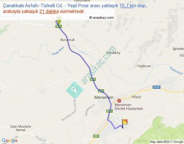 Çanakkale Asfaltı-Türkelli Cd. - Yeşil Pınar arası yaklaşık olarak 90 km/h ile yukarıda belirtilen sürede olup, iki yerin kuş uçuşu uzaklığı (mesafesi) 12'dir. Yolculuk otobüsle 27 dakika sürmektedir.