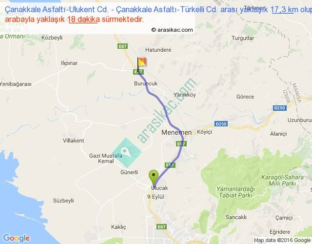 Çanakkale Asfaltı-Ulukent Cd. - Çanakkale Asfaltı-Türkelli Cd. arası yaklaşık olarak 90 km/h ile yukarıda belirtilen sürede olup, iki yerin kuş uçuşu uzaklığı (mesafesi) 14'dir. Yolculuk otobüsle 23 dakika sürmektedir.