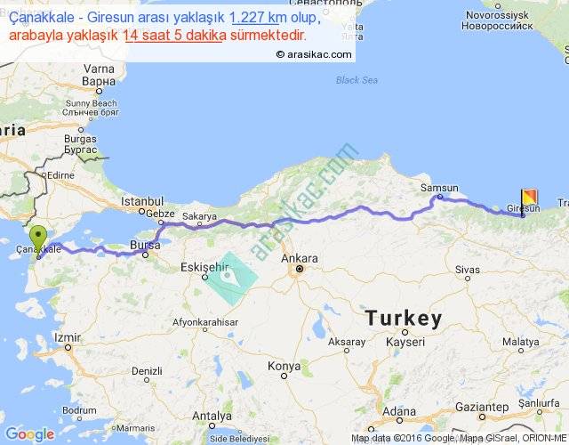 Çanakkale - Giresun arası yaklaşık olarak 90 km/h ile yukarıda belirtilen sürede olup, iki yerin kuş uçuşu uzaklığı (mesafesi) 1010'dir. Eğer belirtilen yerler arasında uçak seferi var ise bu süre uçakla 1 saat 33 dakika'ya kadar düşebilir. Yolculuk otobüsle 18 saat 18 dakika sürmektedir.