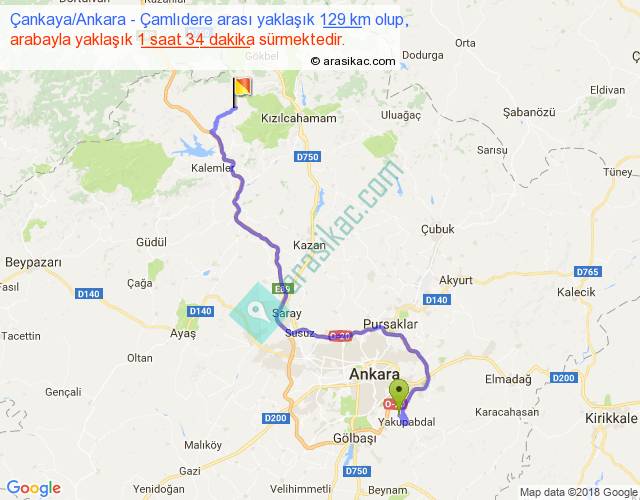 Çankaya Ankara - Çamlıdere arası yaklaşık olarak 90 km/h ile yukarıda belirtilen sürede olup, iki yerin kuş uçuşu uzaklığı (mesafesi) 81'dir. Yolculuk otobüsle 1 saat 57 dakika sürmektedir.
