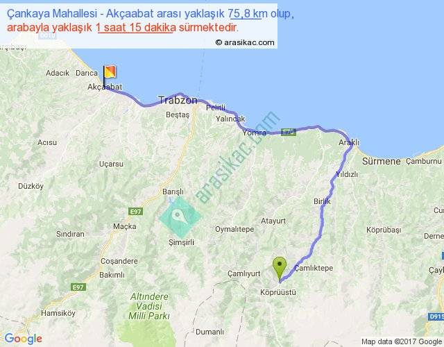 Çankaya Mahallesi - Akçaabat arası yaklaşık olarak 90 km/h ile yukarıda belirtilen sürede olup, iki yerin kuş uçuşu uzaklığı (mesafesi) 43'dir. Yolculuk otobüsle 1 saat 37 dakika sürmektedir.