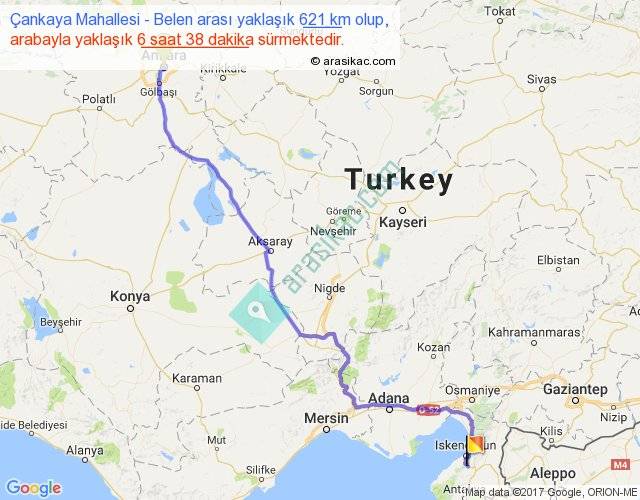 Çankaya Mahallesi - Belen arası yaklaşık olarak 90 km/h ile yukarıda belirtilen sürede olup, iki yerin kuş uçuşu uzaklığı (mesafesi) 477'dir. Eğer belirtilen yerler arasında uçak seferi var ise bu süre uçakla 44 dakika'ya kadar düşebilir. Yolculuk otobüsle 8 saat 37 dakika sürmektedir.