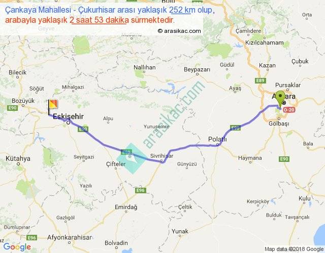 Çankaya Mahallesi - Çukurhisar arası yaklaşık olarak 90 km/h ile yukarıda belirtilen sürede olup, iki yerin kuş uçuşu uzaklığı (mesafesi) 212'dir. Yolculuk otobüsle 3 saat 44 dakika sürmektedir.