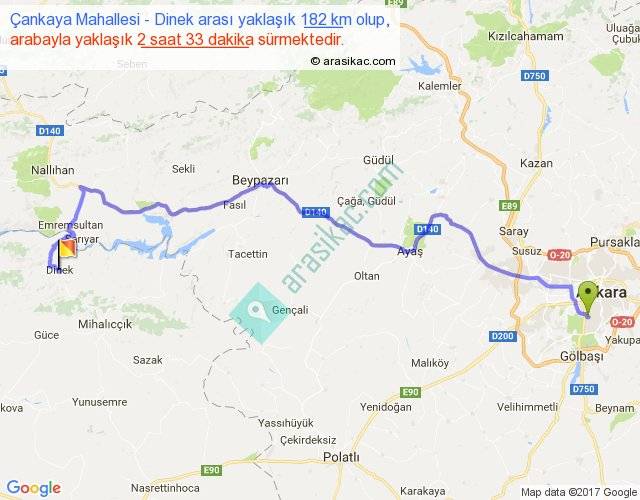 Çankaya Mahallesi - Dinek arası yaklaşık olarak 90 km/h ile yukarıda belirtilen sürede olup, iki yerin kuş uçuşu uzaklığı (mesafesi) 123'dir. Yolculuk otobüsle 3 saat 18 dakika sürmektedir.