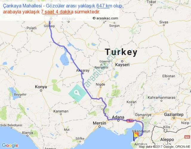 Çankaya Mahallesi - Gözcüler arası yaklaşık olarak 90 km/h ile yukarıda belirtilen sürede olup, iki yerin kuş uçuşu uzaklığı (mesafesi) 472'dir. Eğer belirtilen yerler arasında uçak seferi var ise bu süre uçakla 43 dakika'ya kadar düşebilir. Yolculuk otobüsle 9 saat 11 dakika sürmektedir.