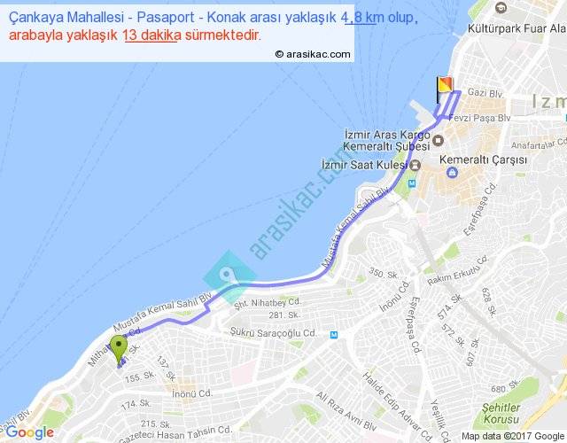 Çankaya Mahallesi - Pasaport - Konak arası yaklaşık olarak 90 km/h ile yukarıda belirtilen sürede olup, iki yerin kuş uçuşu uzaklığı (mesafesi) 3'dir. Yolculuk otobüsle 16 dakika sürmektedir.
