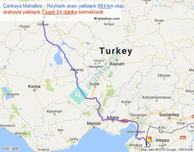 Çankaya Mahallesi - Reyhanlı arası yaklaşık olarak 90 km/h ile yukarıda belirtilen sürede olup, iki yerin kuş uçuşu uzaklığı (mesafesi) 517'dir. Eğer belirtilen yerler arasında uçak seferi var ise bu süre uçakla 47 dakika'ya kadar düşebilir. Yolculuk otobüsle 9 saat 50 dakika sürmektedir.