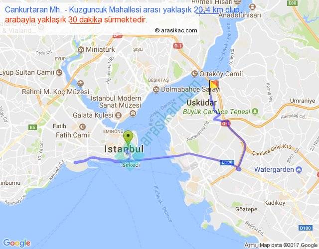 Cankurtaran Mh. - Kuzguncuk Mahallesi arası yaklaşık olarak 90 km/h ile yukarıda belirtilen sürede olup, iki yerin kuş uçuşu uzaklığı (mesafesi) 6'dir. Yolculuk otobüsle 39 dakika sürmektedir.