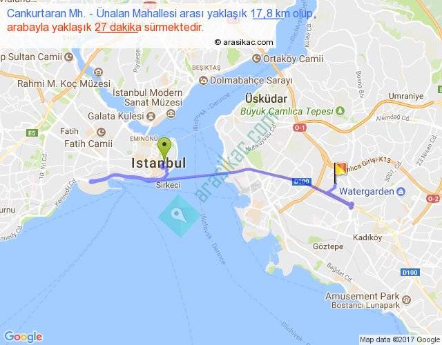 Cankurtaran Mh. - Ünalan Mahallesi arası yaklaşık olarak 90 km/h ile yukarıda belirtilen sürede olup, iki yerin kuş uçuşu uzaklığı (mesafesi) 7'dir. Yolculuk otobüsle 35 dakika sürmektedir.